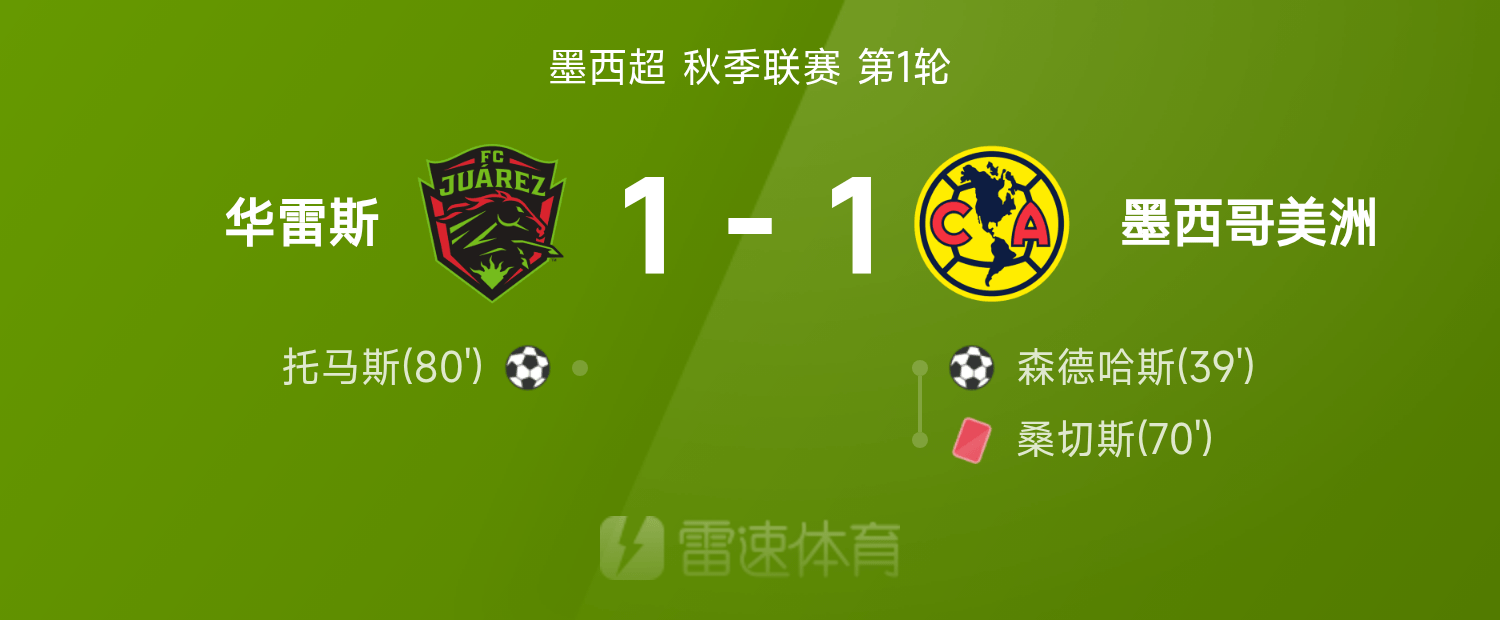 07月12日讯 25/26赛季墨西超秋季联赛第1轮,华雷斯1-1战平墨西哥美洲。全场比赛,森德哈斯、托马斯破门建功,桑切斯染红。