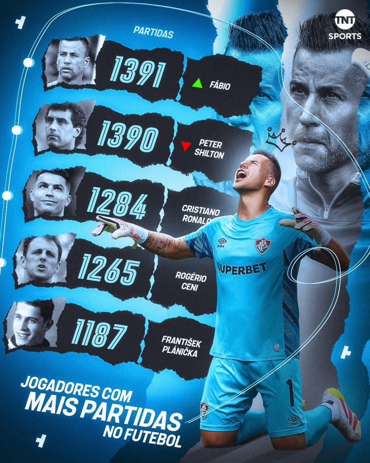 TNT Sports列足坛历史出场数前五,44岁巴西门将法比奥居首,40岁C罗目前落后107场排第三,C罗是榜上唯一一名非门将球员。